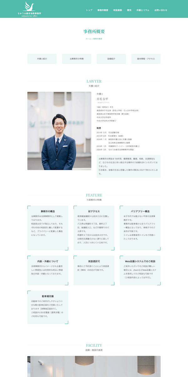 鳥取県米子市にある法律事務所のWebサイト。名刺代わりとなる安心感のある落ち着いたデザインと、知りたい情報へすぐに辿り着けるシンプルな導線を設計。さらにSEOを意識した構成により検索経由のアクセスが大きく増加し、お問い合わせフォームを一時休止するほどの反響につながりました。 地域に根差したビジネスにおける、Web集客のお手本となるサイトです。